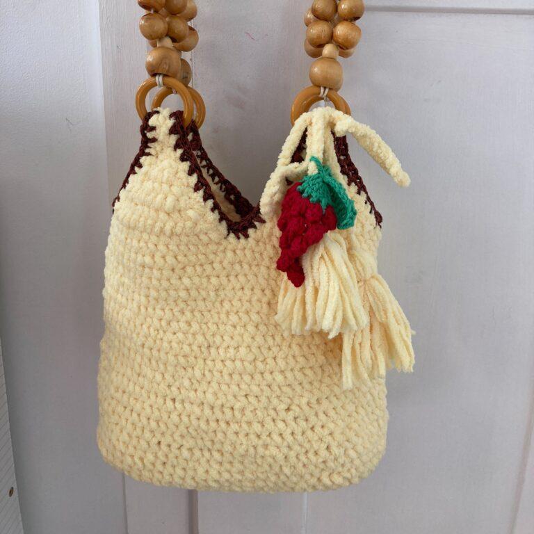 • Este croșetată pe un suport tare, iar mânerul este din lemn cu un accesoriu roșu cu verde.